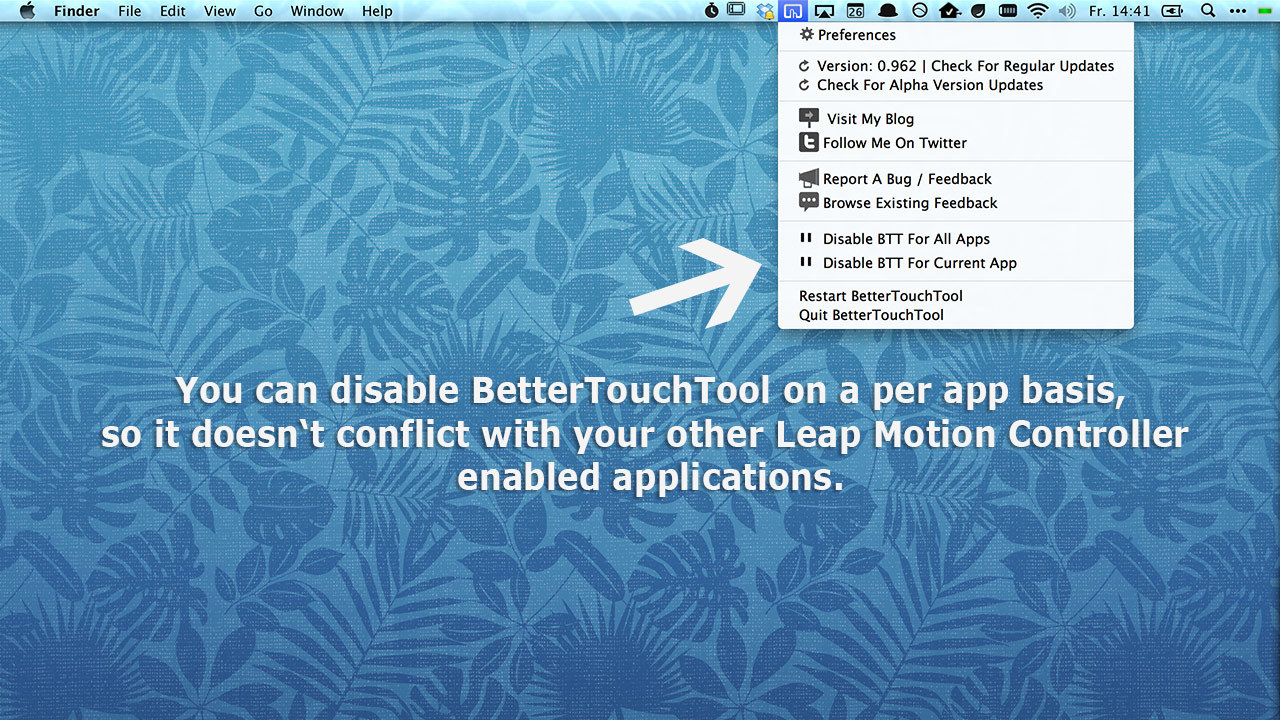 BetterTouchTool now allows you to move your mouse cursor, click and scroll with your Leap Motion Controller. In contrast to other mouse control approaches BetterTouchTool allows you to rest your arm on the table. You only have to point with your fingers to move your mouse or click. If you encounter issues using the mouse control, please contact me.