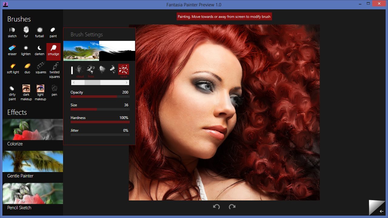 Fantasia Painter has unique brushes (e.g. Fur, Makeup, paint) that adapt to your painting style, speed, direction and nearby colors to make even simple strokes look professional.
