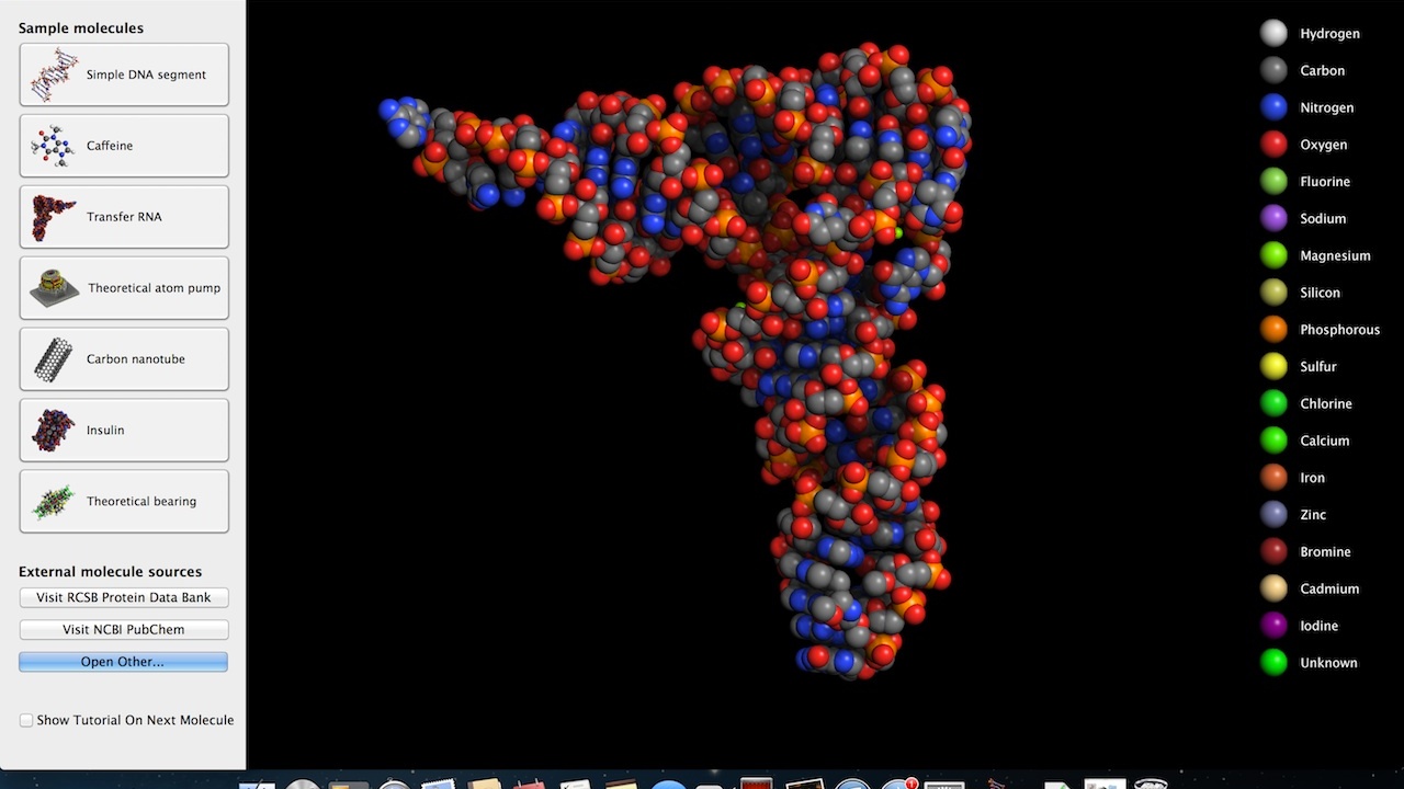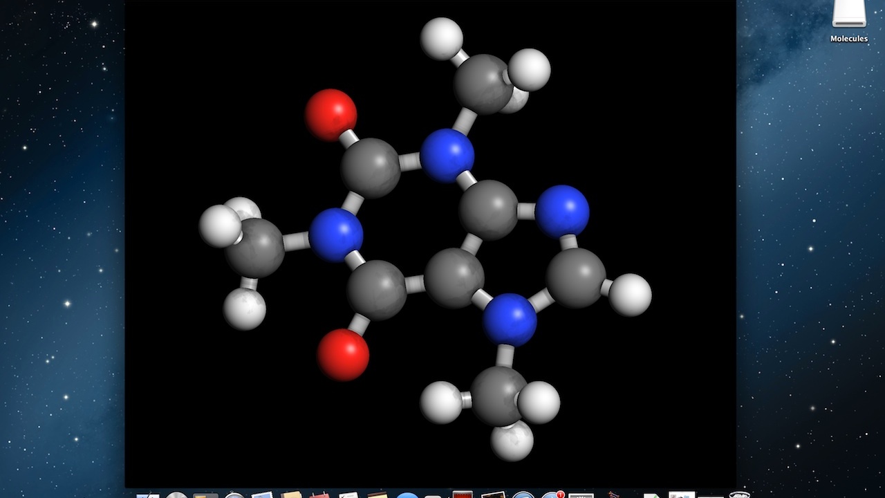 Molecules is a molecular visualizer. It is a file viewer that allows you to display three-dimensional renderings of molecules and manipulate them using a Leap Motion Controller. Molecules can be displayed in a window or in fullscreen mode, and Retina displays are fully supported.