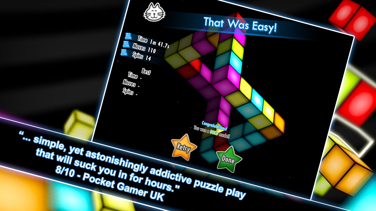 "... this mind-melting title is every bit as compelling as Mr. Rubik's invention...simple, yet astonishingly addictive puzzle play that will suck you in for hours." - 8/10 Silver Award - PocketGamer.co.UK