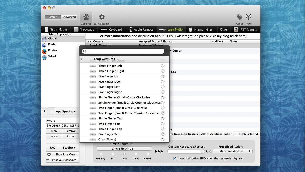 BetterTouchTool is a great, feature packed application that allows you to configure many gestures for your Leap Motion Controller, Apple's Magic Mouse, Macbook Trackpad and Magic Trackpad. It also allows you to configure actions for keyboard shortcuts, normal mice and the Apple Remote. In addition to this it has an iOS companion App (BTT Remote) which can also be configured to control your Mac the way you want.