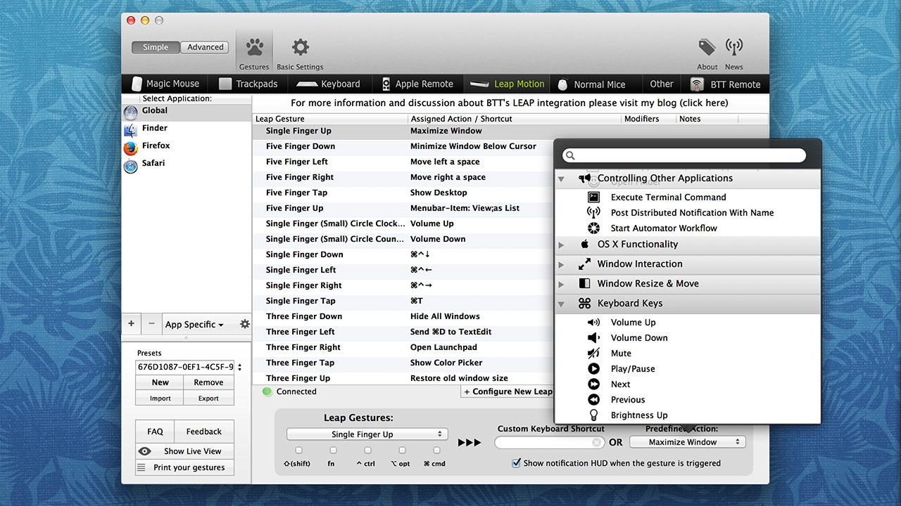 Just downloaded this. This is exactly what I was looking for when I bought a Leap back on May 21st. Lets you map gestures to specific actions. Very responsive and easy.