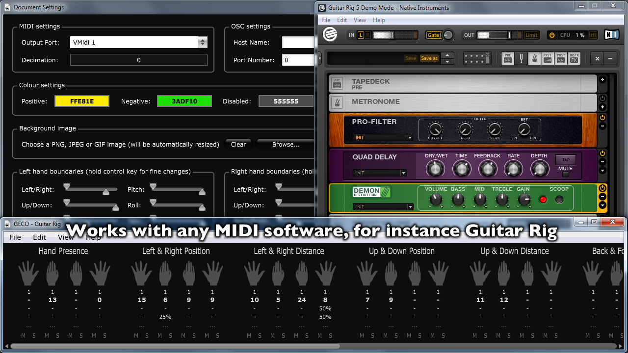 GECO is one of the easiest and most powerful solutions to interact with MIDI/OSC/CopperLan through touchless control. Our custom multi-staged processing engine ensures an extremely low processing overhead and near zero latency, while still providing you with beautiful real-time visual feedback and powerful customization capabilities. GECO has been designed for live performance and quick configuration during rehearsal by industry professionals that have years of experience with high-speed low-latency electronic music software.