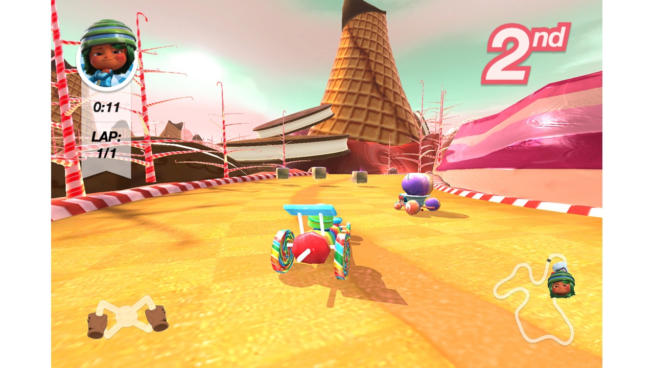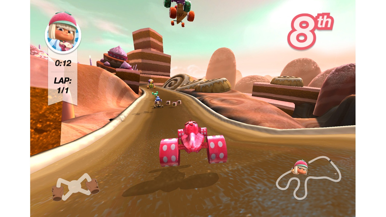 It's like Mario Kart 64 with almost all of the features removed. The racers all seem to have the same stats, and custom karts only give you three choices for bodies and three matching choices for wheels. Not a bad proof of concept for the leap, and it is still fun at its core. Maybe not worth two dollars, but it's not really bad.