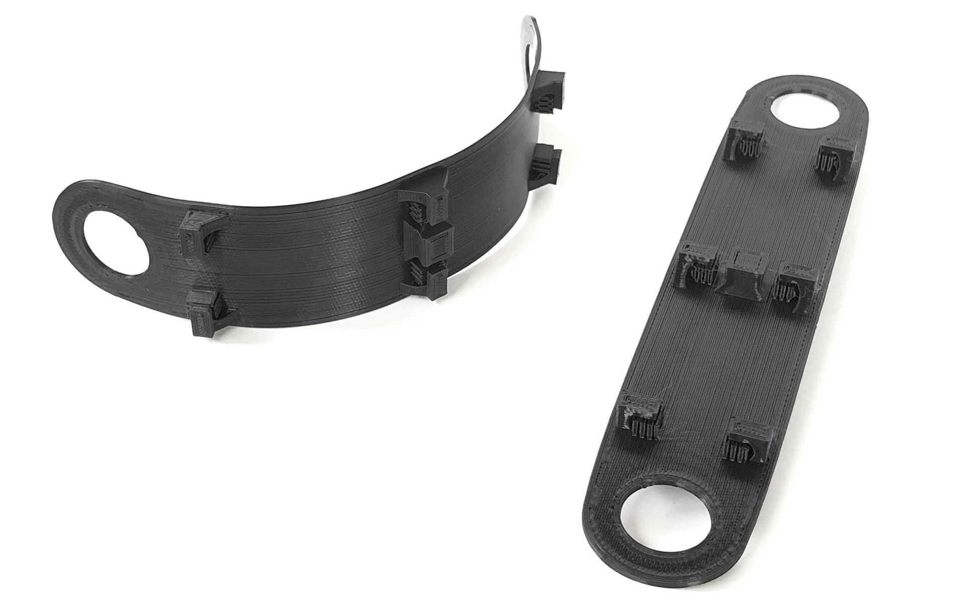 Finally, a little trick we developed for this headgear design: bending 3D prints. An ideal VR/AR headset is light yet strong, but 3D prints are anisotropic – strong in one direction, brittle in another. This means that printing large thin curves will likely result in breaks.