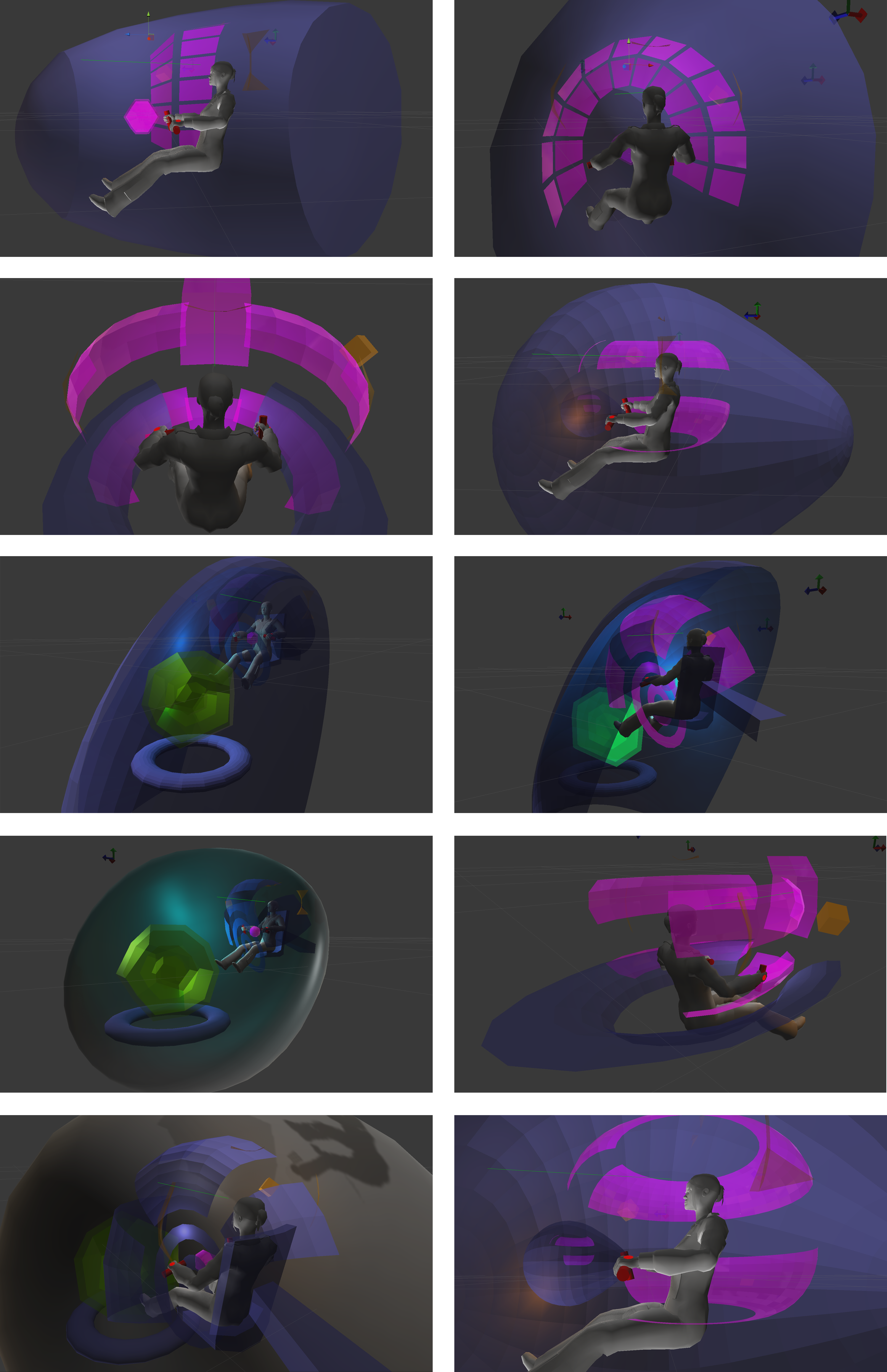 In real life, spaceship cockpits are enormously complicated, involving years (or even decades) of research. In designing the VR Cockpit, we needed to balance ergonomics and hardware tracking range with the visual layout of the console. As part of our VR set design, the team rapidly designed different geometric models in Maya and exported them to Unity (shown below).