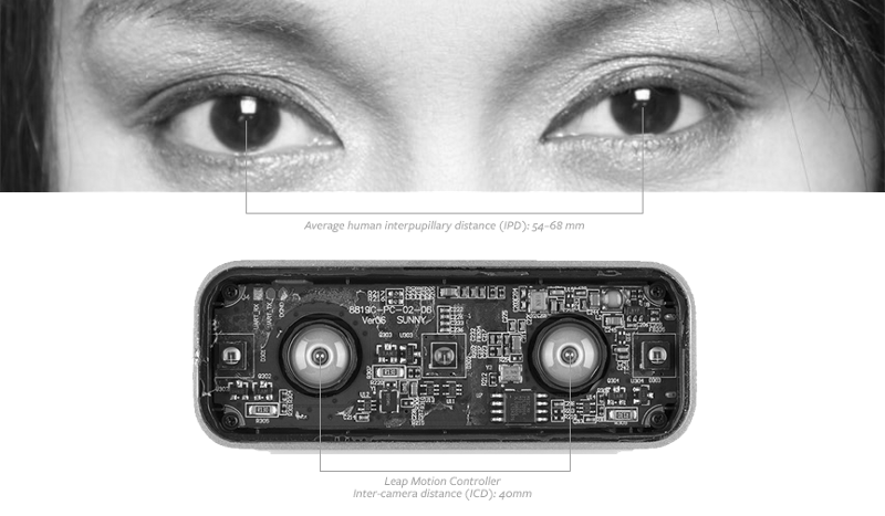 This issue occurs because the Leap Motion Controller sensors are 40 mm apart, while average human eyes are 64 mm apart. Future Leap Motion modules designed for virtual reality will have interpupillary distances of 64mm, eliminating the scaling problem.
