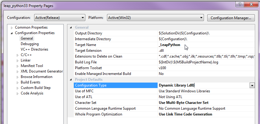 c:\leap_python33>"C:\Program Files (x86)\swigwin-2.0.9\swig.exe" -c++ -python -o LeapPython.cpp -interface LeapPython Leap.iOpen up the project properties, select the Release configuration, and go to the Configuration Properties -> General page. From there, set the 'Target Name' to LeapPython and set the 'Configuration Type' to 'Dynamic Library (.dll)'. (screenshot)