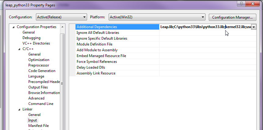 C:\Python33\include. (screenshot)Go to the Linker -> Input property page. Add Leap.lib and the full path to python33.lib, typically