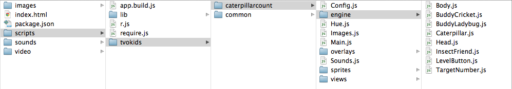 Game developers are used to a particular application structure, where each class is in a separate file, class files are organized into packages/namespaces and clearly list their dependencies (i.e. import), and the Document (e.g. FLA) links to a single Document Class (e.g. Main.as). With RequireJS, we were able to build our game in a way that satisfies all of these criteria.