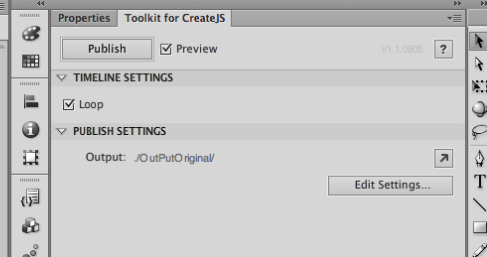 Toolkit for CreateJS is a free extension in Flash CS6 that lets you export reusable vector symbols and MP3-format audio for your CreateJS projects. You can download it from Adobe’s official site. Once you’ve installed it to Flash CS6, you can add to the panel window below:
