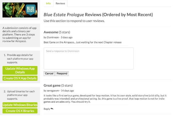 (1) You can go into your app’s Warehouse page and respond directly to a user’s comments.